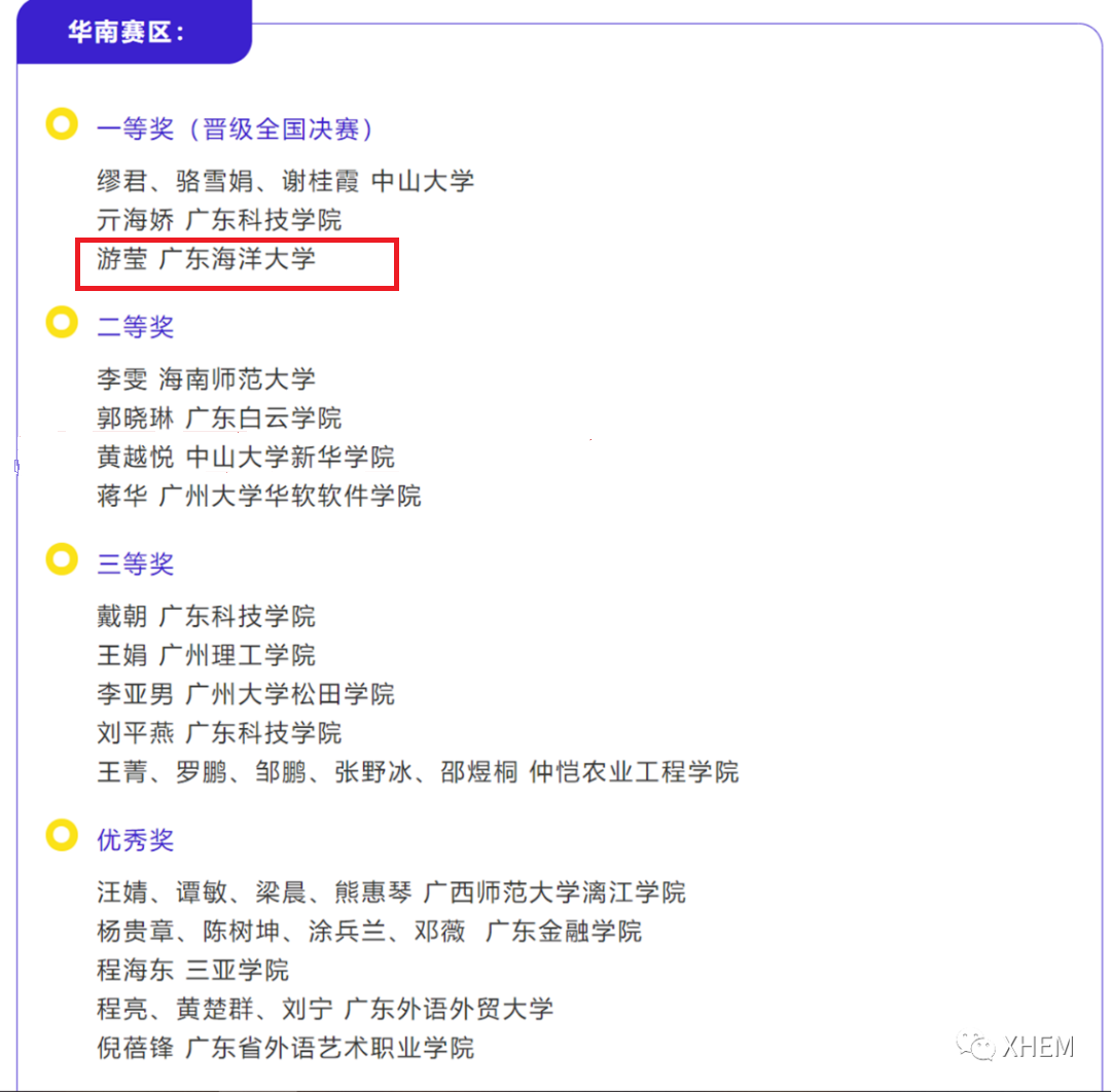 近日,在首届全国翻译技术教学大赛上,永利集团304官网教师游莹荣获华南赛区一等奖。大赛在全国翻译专业学位研究生教育指导委员会、世界翻译教育联盟(WITTA)的指导下,由世界翻译教育联盟翻译技术教育研究会(WITTA TTES)与广东外语外贸大学高翻公司翻译技术教育与研究中心联合主办。此次大赛共分为七个赛区,每个赛区有3-5名业内专家组成评委组进行评审。评委名单提交大赛学术委员会审核同意后,分赛区评委组对各自赛区的作品全程进行匿名评审,最后取评委组的平均成绩进行组内排名,成绩提交全国组委会。全国组委会核对无误后,加入个人选手信息,按照大赛规定的奖项比例产生最终获奖名单。