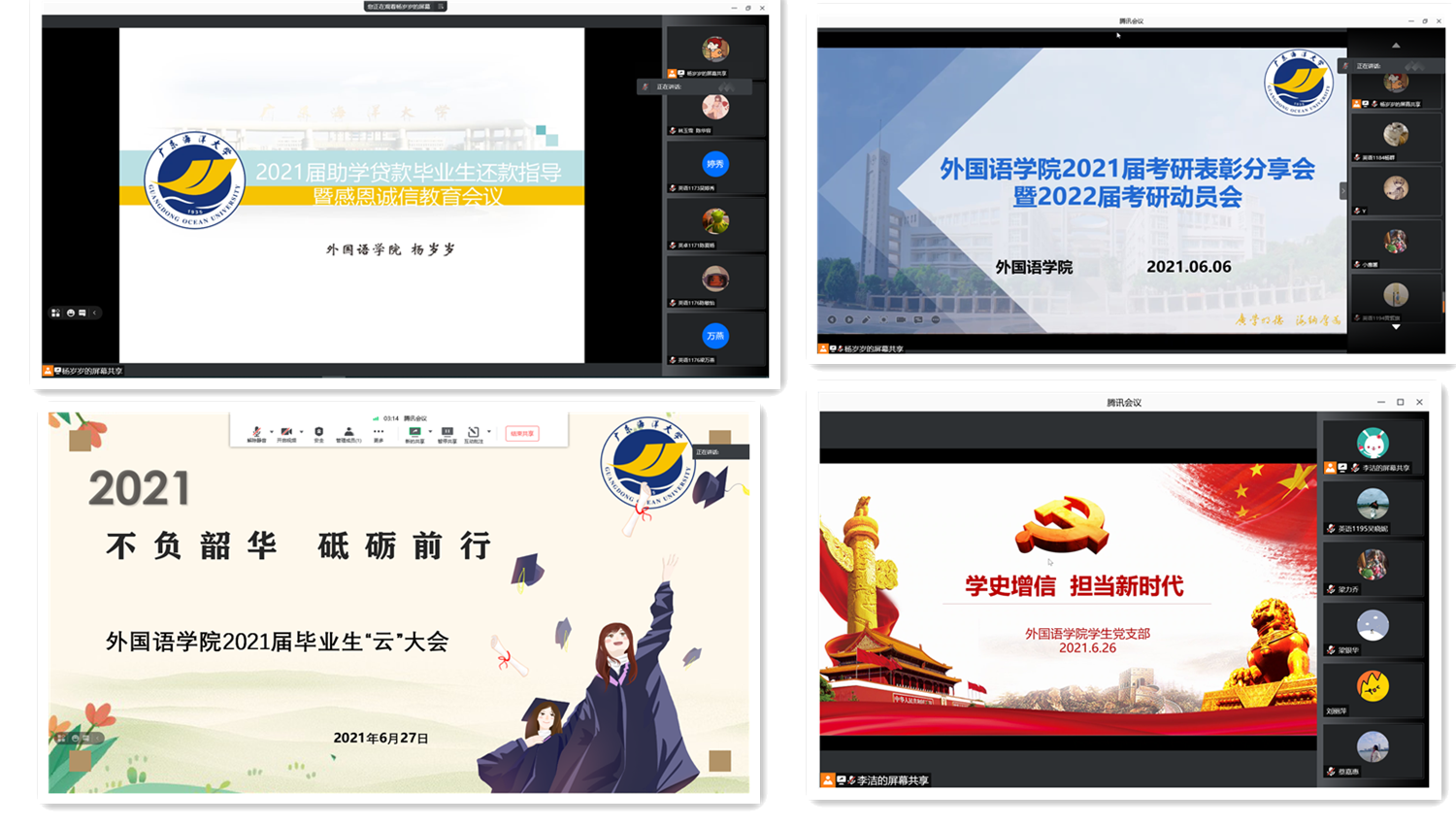 6月27日晚,公司召开“不负韶华 砥砺前行”欢送2021届毕业生“云”大会。永利集团304官网全体领导、毕业生班主任、辅导员及2021届毕业生200多人参加了会议。与会领导和老师们历数本届毕业生取得的各项优秀成绩,肯定了同学们的努力与付出,表达了对同学们的不舍和祝福,嘱咐同学们要坚定理想信念,懂得感恩,砥砺奋斗。外院优秀毕业生代表韦杨辉回顾了大学四年的美好时光,感恩母校的教育和培养,表达了对海大的依依不舍之情,2018级员工代表魏俊杰感谢即将毕业的师兄师姐们对后辈的帮助和指导,祝福他们乘风破浪、披荆斩棘、前程似锦。会议进行中,同学们纷纷在留言框写下了自己的不舍、对老师的感激以及对母校的祝福。