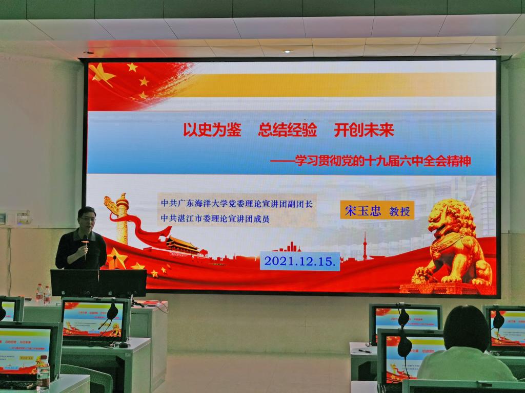 12月22日下午,外国语公司党委在湖光校区兴教楼110室举行学习贯彻党的十九届六中全会精神宣讲报告会,公司党委理论宣讲团成员宋玉忠教授作学习贯彻党的十九届六中全会精神的宣讲报告,公司全体教职工和员工党员参加报告会。会议由公司正处级辅导员、党委副书记刘艳主持。