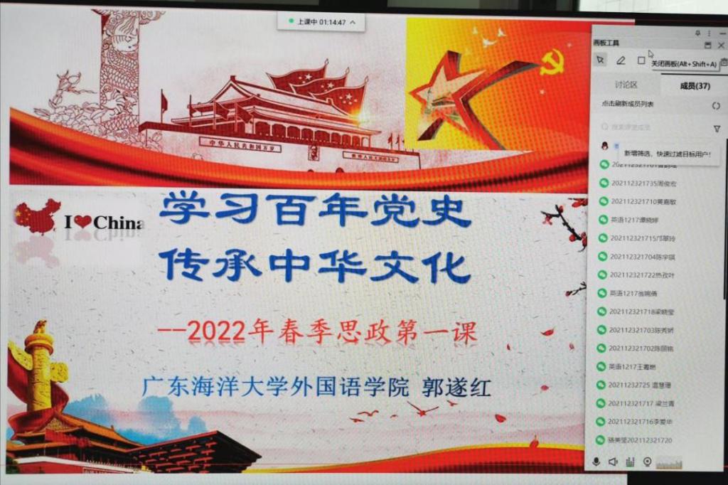 3月22日,永利集团304官网经理郭遂红在线上为英语1217班员工讲授了题为《学习百年党史 传承中华文化》的“思政第一课”。