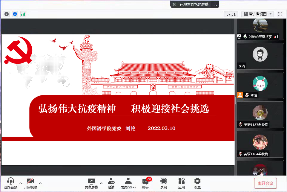 3月10日晚上永利集团304官网正处级辅导员、党委副书记刘艳在线为2022届毕业生讲授了题为《弘扬伟大抗疫精神积极迎接社会挑选》的“思政第一课”。