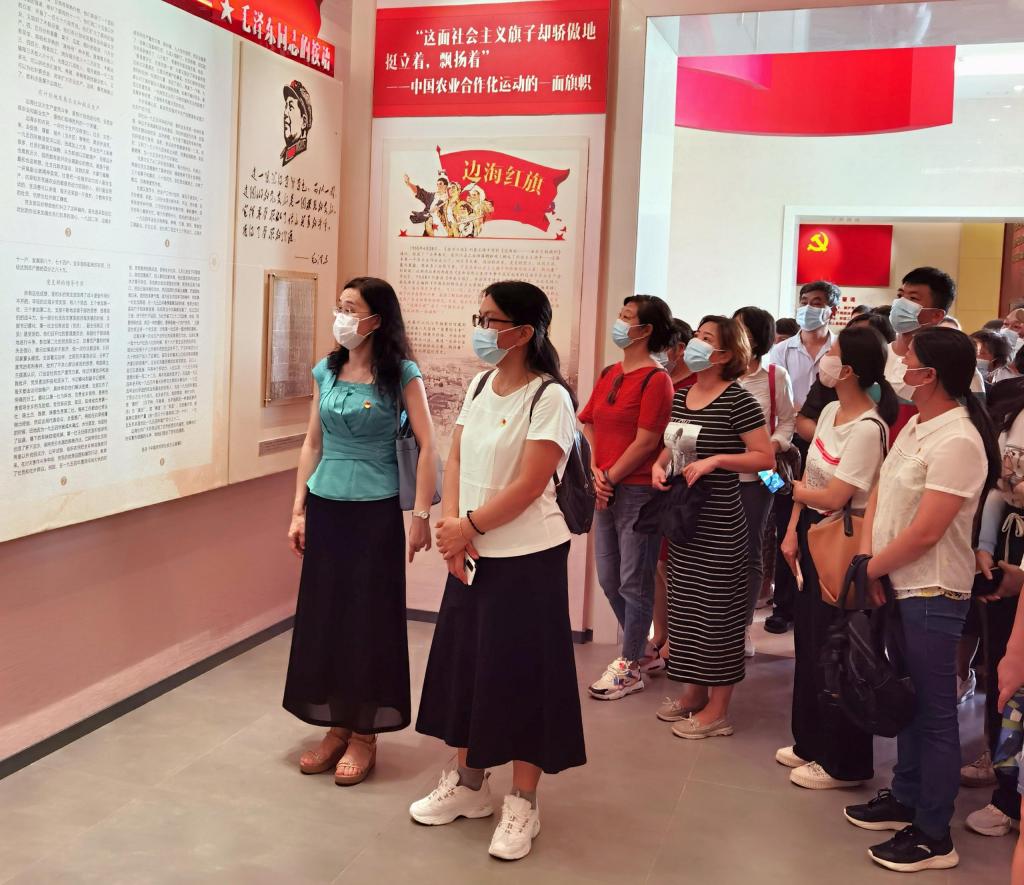 在阳西县儒洞镇边海村红色展馆,讲解员带领大家回顾了边海村的红色革命历史,边海村筚路蓝缕、栉风沐雨的峥嵘岁月以及垦荒造田、引水灌溉的历史,深入体会边海党支部战天斗地、拦河筑坝的斗争精神,开天辟地、围海造田的创造精神,让大家深刻领会党群连心、勇立潮头的精神实质。60多年前,毛泽东同志亲笔批示边海乡党支部为“模范的支部”。近年来,边海村更是通过弘扬传承“边海红旗”精神,以红旗精神推动乡村振兴战略,引领基层党建全面夯实,边海村新农村建设取得了显著成效。红色展馆中,展现的历史遗物、图片影像资料以及阳西革命先辈的革命历程,让大家经受了一次精神的洗礼和灵魂的升华,受到了一次深刻的党性教育。在鲜红的党旗下,刘艳带领党员重温入党誓词。