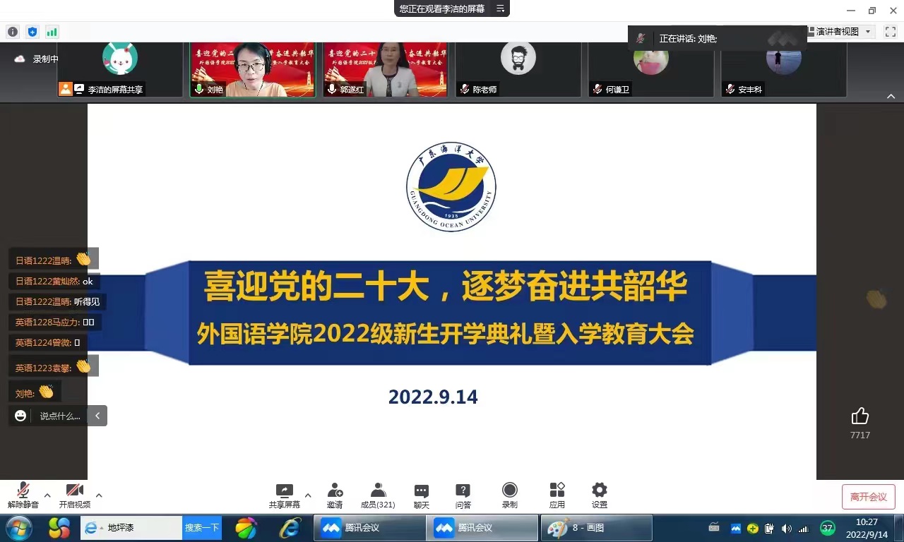 为了帮助2022级新生更快适应大公司园,融入集体生活,9月14日上午,永利集团304官网在云端召开2022级新生开学典礼暨入学教育大会。公司领导、英(日)语系主任、新生班主任、辅导员及2022级全体新生参加会议,会议由公司正处级辅导员、党委副书记刘艳主持。