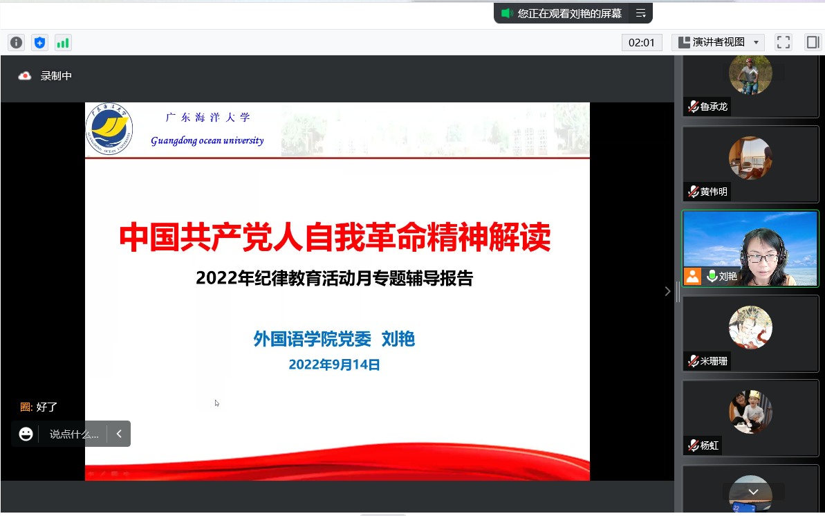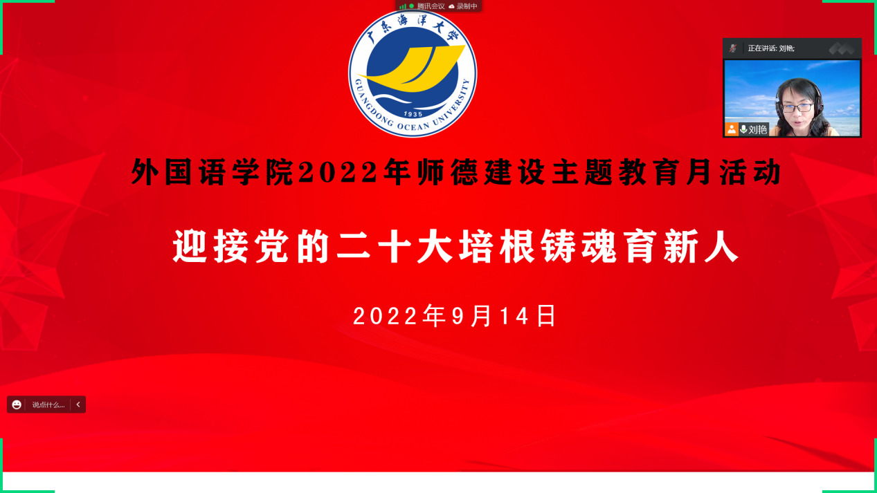 随后,刘艳以“迎接党的二十大,培根铸魂育新人”为主题对永利集团304官网2022年师德建设主题教育月活动进行了总动员,分享了湛江市违反中央八项规定精神典型案例。她强调在党的二十大召开之际,全体师生要更加坚定理想信念、勠力同心,为党的二十大胜利召开创造安全稳定的校园环境。