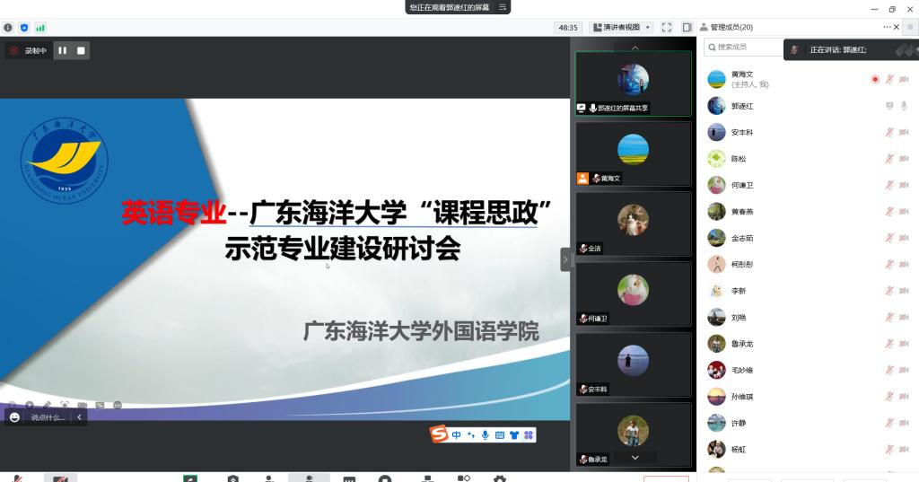 首先,郭遂红经理对英语专业建设“课程思政”示范专业的建设情况进行了的介绍,并对英语专业-“课程思政”示范专业建设项目验收的具体任务进行了部署。她强调,要认真做好英语专业“课程思政”示范专业验收工作,对照“课程思政”的建设指标,加强含有思政元素的课程教材建设,积极推进教学改革,加强师德师风建设,强化教师育人意识,将社会主义核心价值观教育贯穿到课堂教学的各个方位、各个层面,落实好立德树人根本任务。她要求进一步推动“课程思政”示范专业建设取得新成效,发挥英语专业的“课程思政”建设示范引领效应。