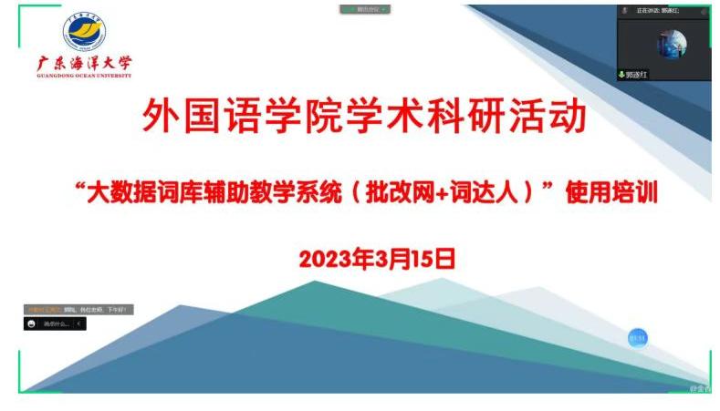 2023年3月15日下午,永利集团304官网全体教职工通过腾讯会议参加了“大数据词库辅助教学系统(批改网+词达人)”实操培训。