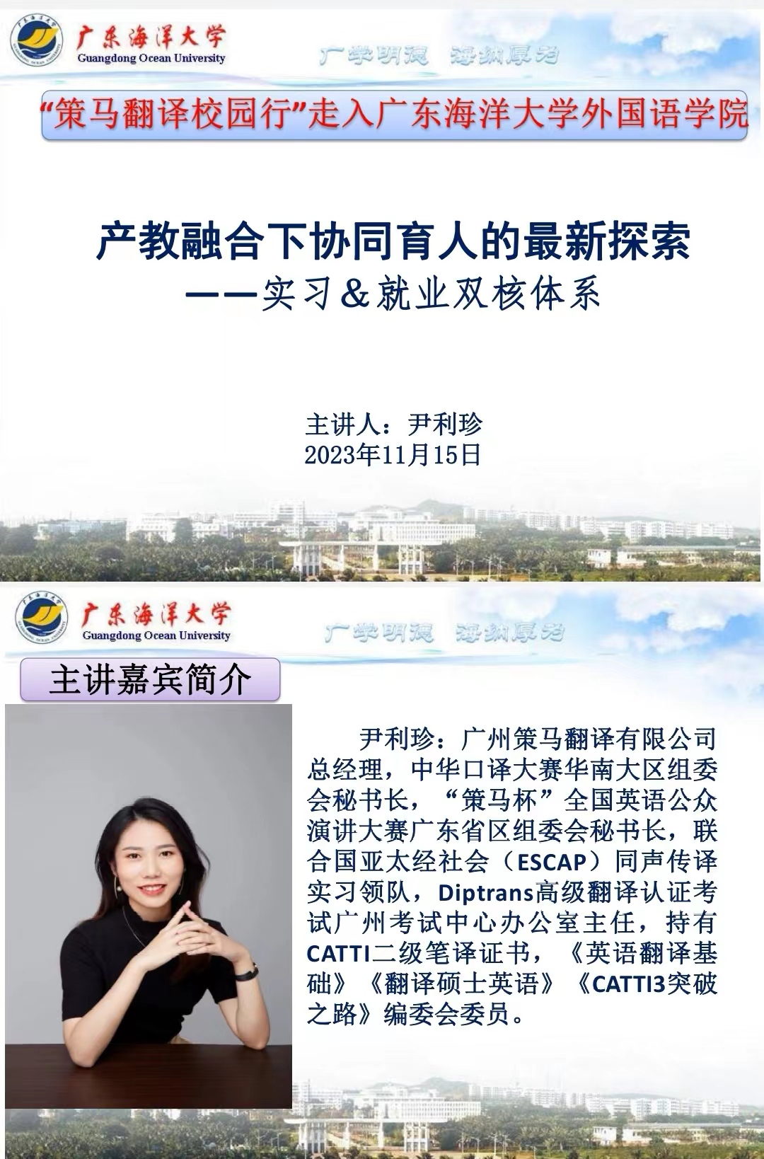 2023年11月15日下午,永利集团304官网邀请广州策马翻译有限公司总经理尹利珍在线做了题为“产教融合下协同育人的最新探索——实习&就业双核体系”专题讲座,公司部分翻译骨干教师和英语专业翻译方向近百名本科员工参加了讲座。活动由公司翻译专业教师陈松主持,公司党委刘艳书记作了总结发言。