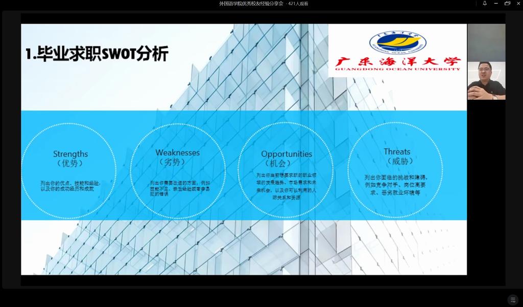 分享会现场,傅庆杰从海外销售、海外市场、英语老师、海关出入境及外语翻译五个方面展开阐述,强调要不断提升外语专业化水平。刘育珠老师深耕英语教学领域10多年,向师弟师妹们分享了在教育培训机构工作的心得体会,引发员工深刻思考。管纪鹏和饶若馨则从求职SWOT分析、求职失败案例和如何成长为职场精英等方面进行探讨,并在互动评论区与师弟师妹们实时交流,近500条的发言评论将分享会推向高潮。