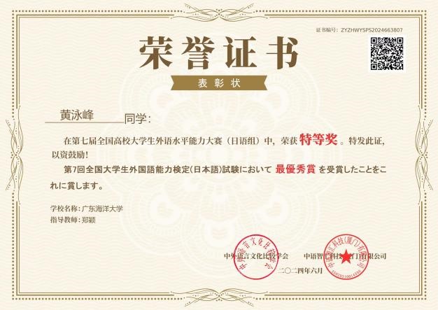 由中外语言文化比较学会举办的第七届全国高校老员工外语水平能力大赛于今年6月落下帷幕,公司永利集团304官网日语专业员工荣获特等奖1个、一等奖4个、二等奖4个。其中,黄泳峰同学荣获特等奖,叶润源、李智宇、谢雨彤、陈毅铖同学荣获一等奖,蒋子丹、罗灿星、刘延锋、黄嘉豪同学荣获二等奖。