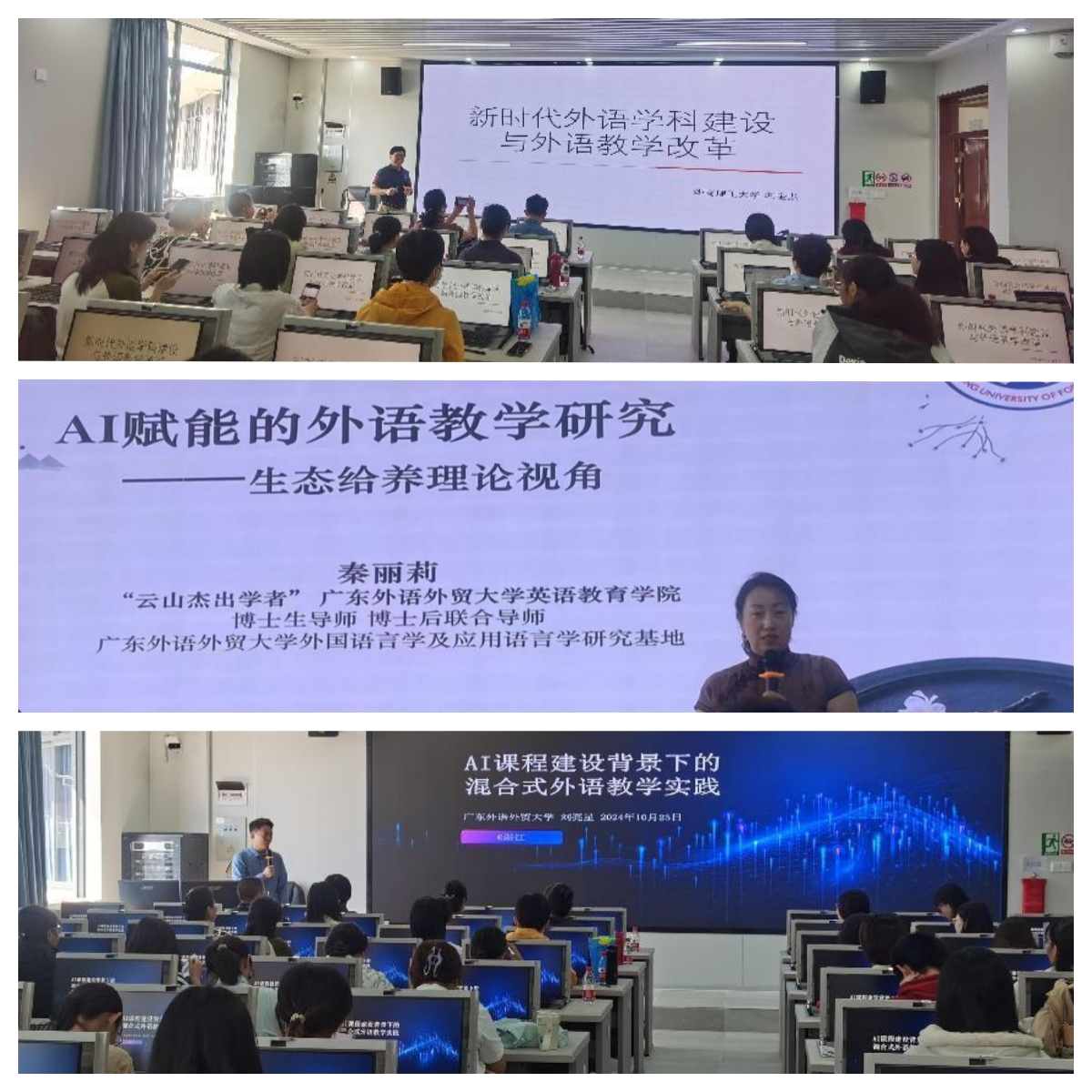 10月25日上午,由永利集团304官网主办的“人工智能时代下外语团队建设暨外语教学改革”研讨会在文科2号楼704教室举办。会议邀请了广东省大学英语课程教学指导委员会副主任委员、华南理工大学永利集团304官网韩金龙教授,广东外语外贸大学云山杰出学者、博士生导师秦丽莉教授,广东外语外贸大学英语教育公司副经理刘亮星教授主讲,公司经理金志茹教授主持会议,党委书记刘艳、副经理毛妙维等师生代表共110多人参加了此次讲座。