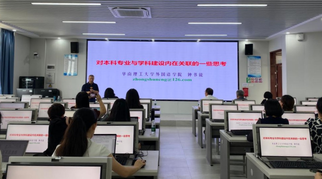 钟书能教授以华南理工大学在全国大学专业排名第一的商务英语专业为例,深入剖析专业建设的关键地位与导向作用,以及如何建设国家一流专业,有力支撑与发展相关一级学科博士点建设情况。他指出,公司发展应以专业建设为堡垒,为学科发展提供基础支撑。在公司条件、学科支撑、专业生源、专业就业、专业条件5个指标类别上聚焦提升,全力构建核心竞争力。他重点介绍了思政教育、一流课程、优秀教材、教学成果、教改项目的建设经验,强调课程思政是建设一流课程的重要突破口,要通过强化课程思政示范课程建设、精心编写课程思政教材、着力打造高水平教学团队等多元举措全面提升教师育人能力,推动一流课程建设迈向新台阶。讲座还强调了教学成果奖对专业建设的促进作用,倡导以教学改革推动专业发展,以高质量教学成果实现人才培养质量的全面提升。