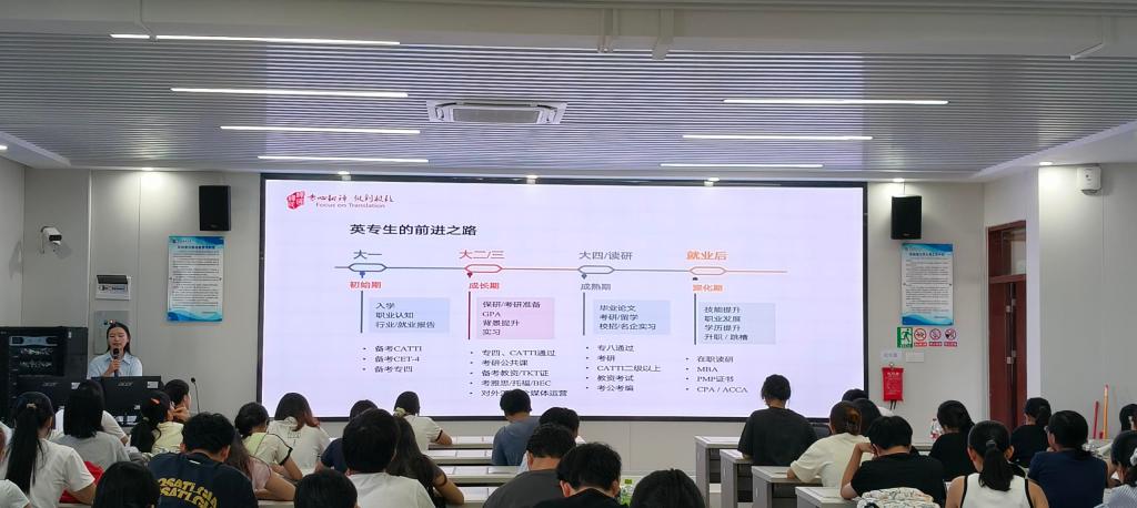 在分析AI时代语言服务行业变革时,尹周锐结合数据指出了翻译兼职化趋势显著、领域高端化需求凸显、机器化浪潮重塑行业模式等三大趋势。针对语言类人才的生存突围路径,尹周锐提出“专业本领强+工具善用”的核心策略,强调AI无法替代人类在语境理解、文化适配、专业深度上的优势,人类译员需承担译文质量的最终责任,而“译后编辑能力+细分领域知识”是语言类人才的核心竞争力所在。此外,讲座还结合英专生成长周期,梳理出规划路径,为不同阶段员工提供精准指引。