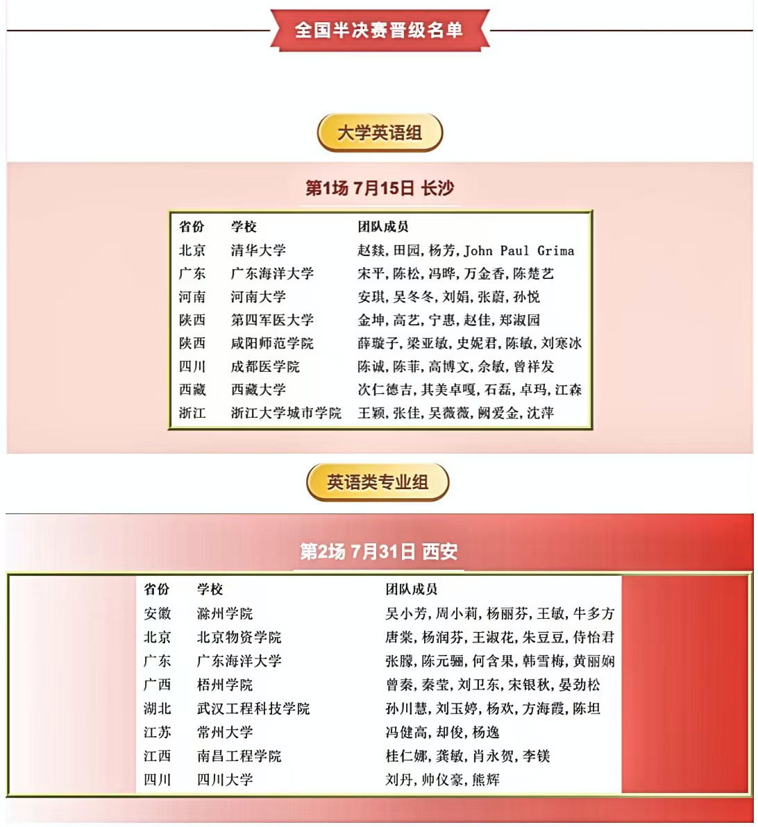 近日,2023年外研社“教学之星”大赛全国复赛获奖名单公布,公司永利集团304官网英语类专业组张朦老师团队(张朦、陈元骊、何含果、韩雪梅、黄丽娴)、大学英语组宋平老师团队(宋平、陈松、冯晔、万金香、陈楚艺)喜获2023年外研社“教学之星”大赛全国复赛“英语类专业组”特等奖和“大学英语组”特等奖,双双晋级全国半决赛,大学英语组和英语专业组将分别于7月15日和7月31日在长沙和西安参加现场比赛,广东省仅有4所高校进半决赛,公司是广东省唯一两个组别同时进半决赛的高校。