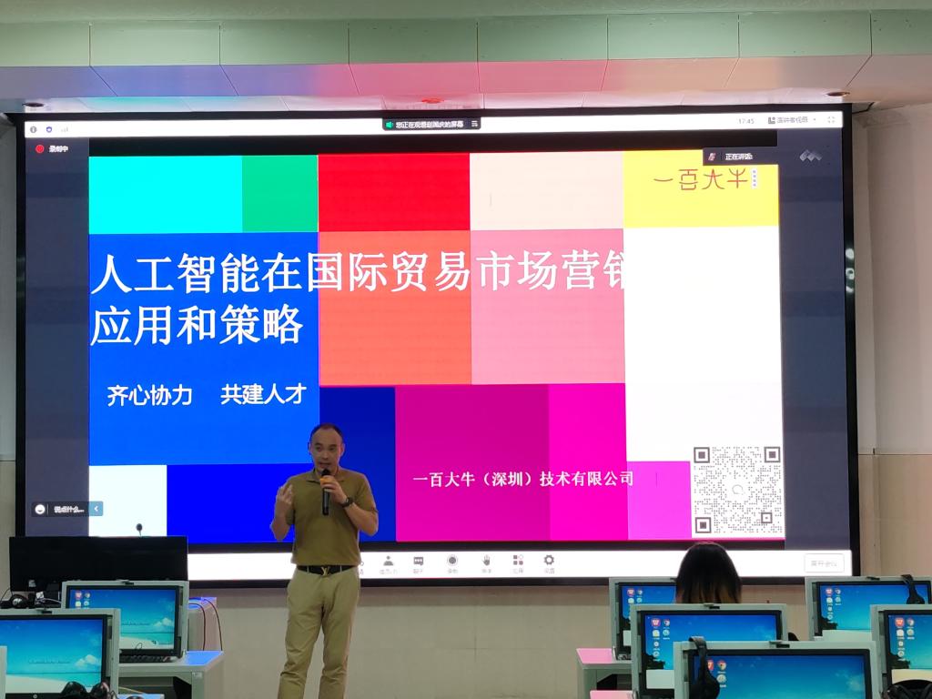 2023年11月22日晚,永利集团304官网行业导师,一百大牛(深圳)技术有限公司创始人赵国庆在兴教楼110作了题为《人工智能在国际贸易市场营销中的应用和策略》讲座。2020级英语专业商务英语方向百余名员工参加讲座。讲座由永利集团304官网副经理安丰科主持。