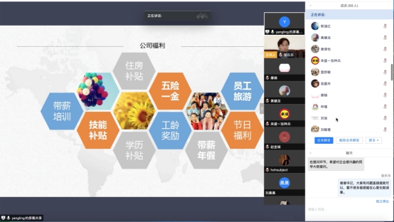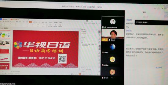 本次“云招聘”由日语系副主任、日语专业负责人张乐乐副教授主持和召集。招聘会邀请了广州联普翻译有限公司、早道(大连)教育科技有限公司、水木日语教育科技有限公司、蒲公英乐学日语教育(广东)有限公司、广州市新为学商务服务有限责任公司等10家用人单位参加。各用人单位按照会议安排次序,依次进入“会场”宣讲,分别就公司背景、发展现状、招聘需求等内容为同学们做了详细介绍。会上,2020届日语专业毕业生结合自身实际,就薪酬待遇构成、培训和晋升机制、食宿条件等具体问题积极同招聘单位进行交流,各用人单位一一耐心解答,线上招聘宣讲过程互动氛围热烈,赢得用人单位和员工的一致好评,有效促进了校企双方的信息沟通。在线招聘会结束后,外国语公司党委书记李国芳和公司经理郭遂红对此次招聘活动进行了总结发言,对本次“云招聘”的筹备工作给予高度肯定,并鼓励毕业班员工积极联系用人单位,咨询就业指导老师,以确保疫情期间毕业生就业工作的顺利进行。