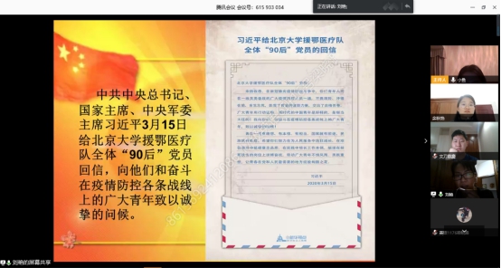 公司党委副书记刘艳为支部党员同志讲授《让青春在党和人民最需要的地方绽放绚丽之花》的主题党课。刘艳首先与大家分享了习近平总书记给北京大学援鄂医疗队全体“90后”党员的回信,并以疫情防控期间全国各地义无反顾地逆行而上援助湖北的白衣天使们的可歌可泣的感人事例以及公司学子主动承担抗疫一线志愿服务工作的生动案例,展现了海大青年对国家和民族的责任担当。她对支部的员工党员提出两点希望:一是希望员工党员深刻领会习近平总书记回信中对青年的热切期望,利用大好青春时光、利用自身专业特长,用有限的能力投身到无限的为人民服务中;二是新时代的青年党员要时刻起到模范带头作用,在国家困难时要坚决挺身而出,牢记初心使命,将青春和热血奉献给国家。